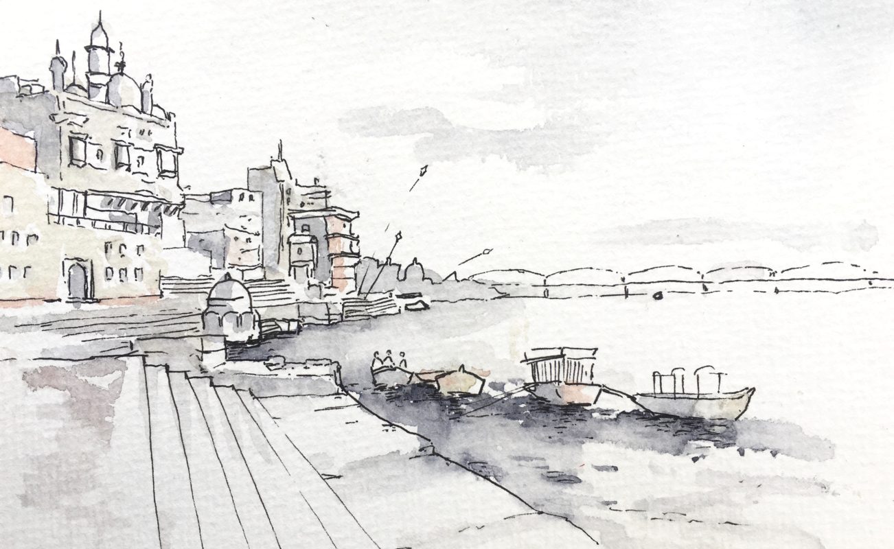 And then to Varanasi. The city Varanasi is one of the holiest places in India, situated along the Ganges. It is said that whoever dies here reaches moksha instantly and is thereby liberated from the cycle of death and rebirth. It is also a place where a lot of burials take place: on two sites, so called burning ghats, along the river, every day approximately 250 bodies are burned on bonfires without break during day and night. Varanasis riverfront is a bizzare place – from a european perspective architecturally and spatially reminescent of venice. Standing at a burning ghat one feels the heat of the fire. The smoke fills the air and burns in the eyes and in the throat. In the sky dozens of kites are flying, independently from the fires, it just seems to be a favourite pastime of children. On the Ganges small candles float in between groups of boats, filled with tourists. The closest relatives of the deceased shave their heads and take a dip in the holy sewage-filled waters of the Ganges. Bodies, completely covered in orange cloth, marigolds and gold foil are being carried here on bamboo stretchers. The floor is filled with trash: flowers, cloth and broken bamboo. In between cows are looking for food and stray dogs are roaming around or taking a shit. And there seems to be nothing strange about any of this.